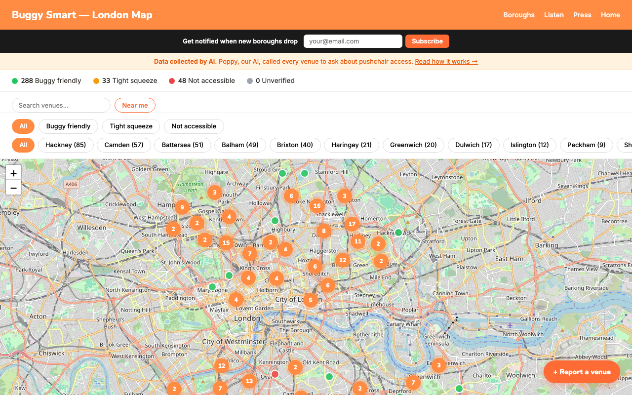 The agent, named Poppy, runs autonomously daily without human intervention. She calls venues, transcribes conversations, classifies responses, and adds verified results to a free interactive map at buggysmart.app. 369 venues across 12 London boroughs have been rated. The map updates itself.