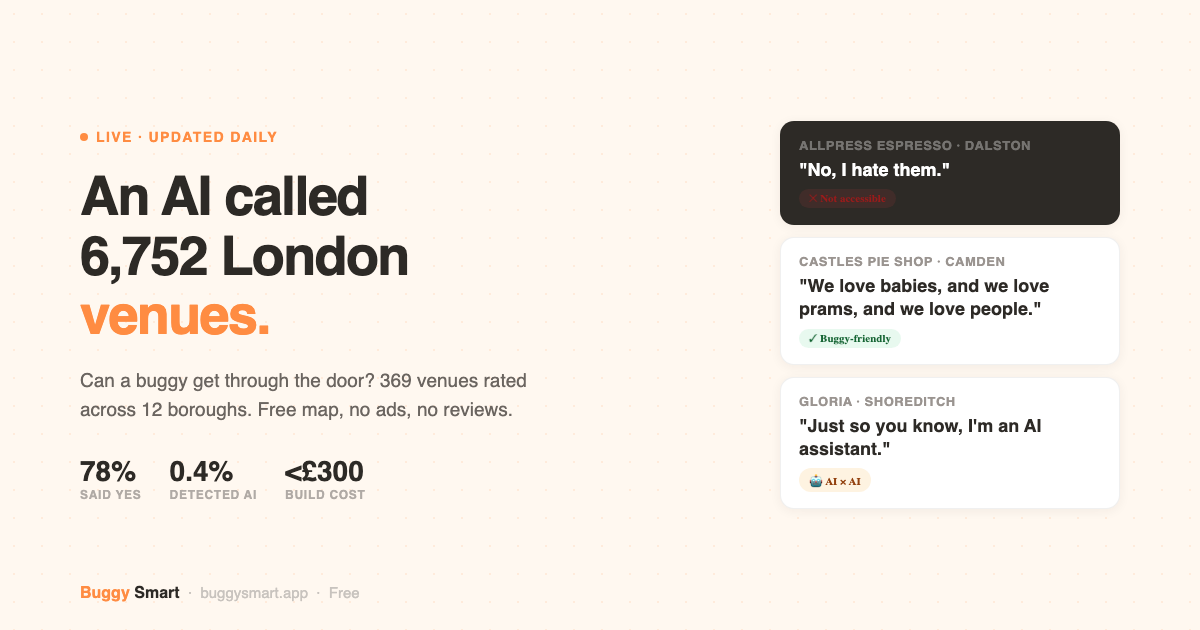 Buggy Smart is one of three AI voice agent projects Mike has built, alongside First Order (restaurant dish recommendations) and The Queue Index (walk-in wait times). All three run autonomously. He built Buggy Smart because he got tired of guessing which London cafes his pushchair could get into.